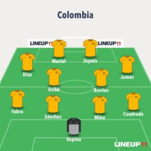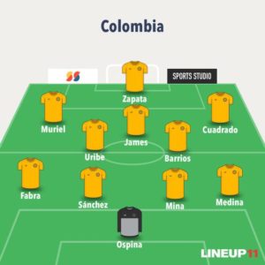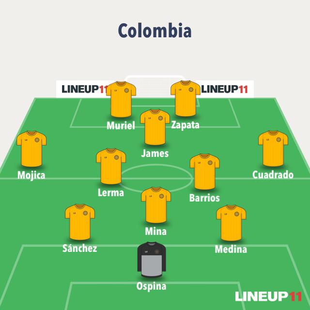 Stefan Medina sería el central por la derecha junto a Mina, en el centro, y Sánchez, en la derecha. Frank Fabra sería reemplazado por Johan Mojica, un lateral más acostumbrado al trabajo de carrilero. Del otro lado estaría Cuadrado. En el centro del medio campo, Barrios y Lerma darían dinamismo y velocidad al juego. También, le cubrirían las espaldas a James, que jugaría de media punta. Él asistiría a Duván y Muriel, delanteros.