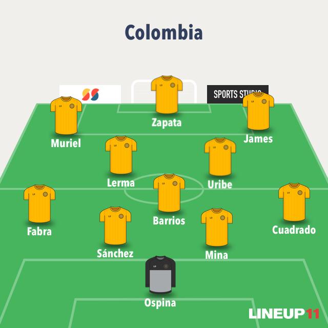 Posibles titulares: David Ospina; Stefan Medina, Yerry Mina, Dávinson Sánchez, Frank Fabra; Wilmar Barrios, Mateus Uribe; Juan Cuadrado, James Rodríguez, Luis Muriel; Duván Zapata.