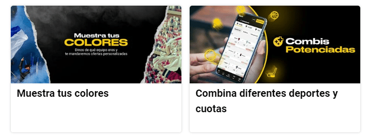 - Combis potenciadas: disfruta de la opción de apuestas combinadas para los distintos deportes que ofrece el operador. Realiza tu cuota mínima de 1.5 entre fútbol, hockey sobre hielo, baloncesto, tenis o tenis de mesa. Combina desde 3 apuestas y mientras más combines más aumenta el porcentaje del beneficio. El tope máximo es 30% con 9 combinaciones.